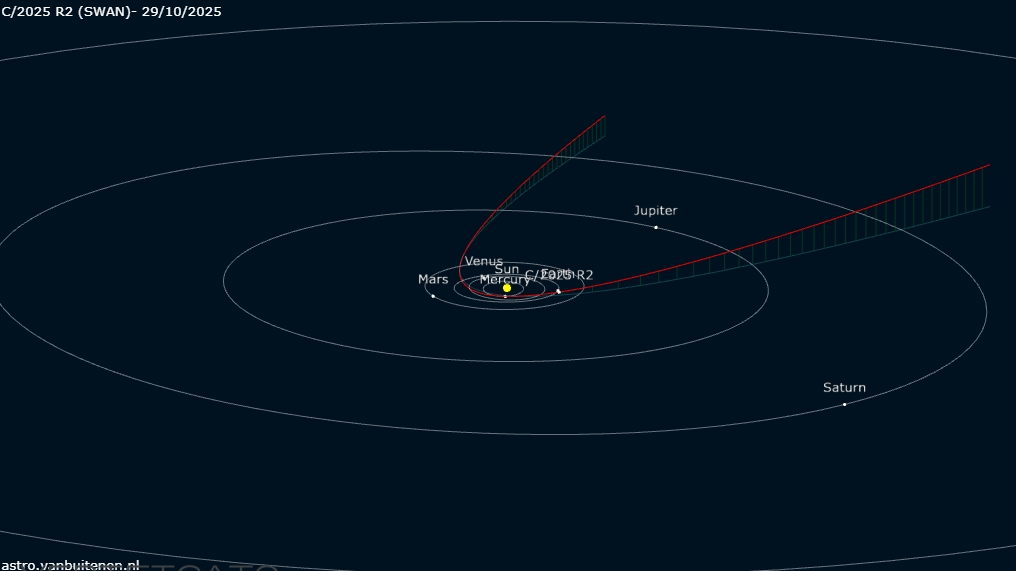 Come vi avevo promesso, ieri 28/10/2025 ho effettuato la ripresa in multi frame del viaggio della cometa C/2025 R2 (SWAN). Ho utilizzato diverse tecniche per allineare i frame e comporre la gif animata che è facilmente fruibile sui diversi dispositivi mutimediali