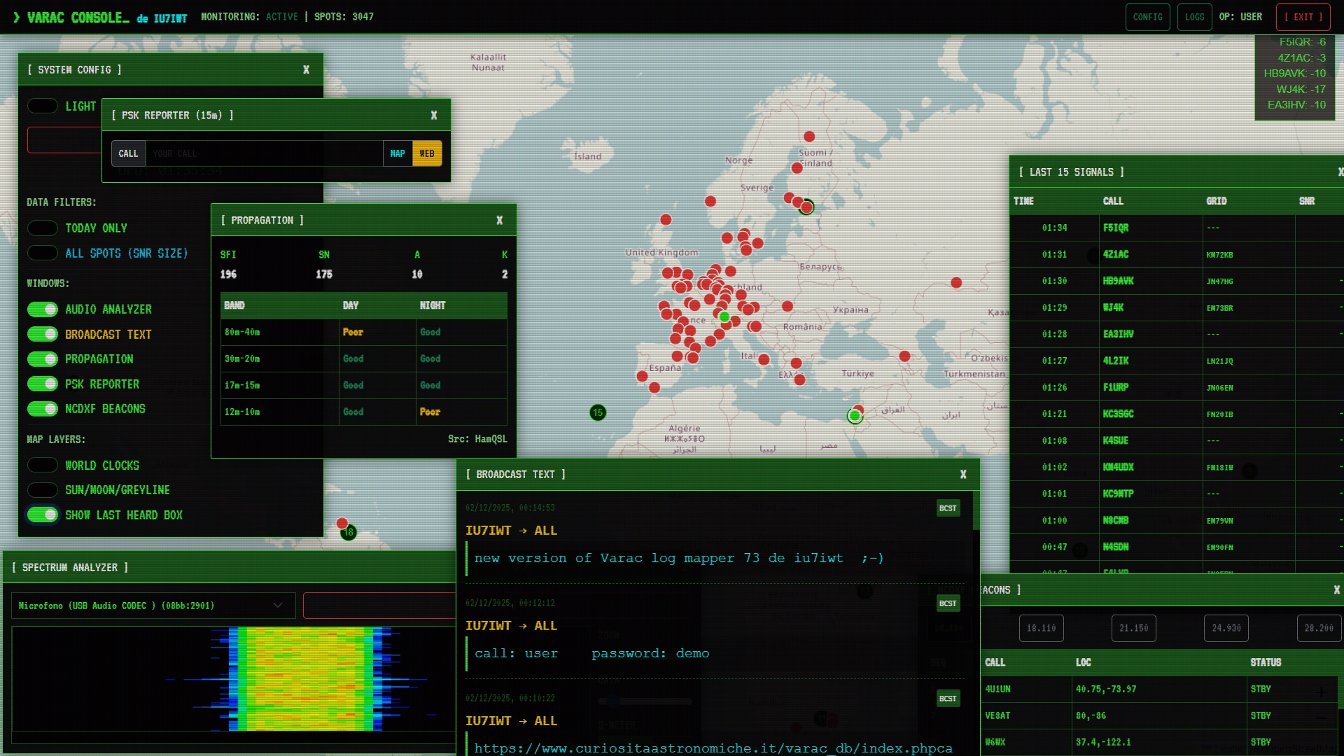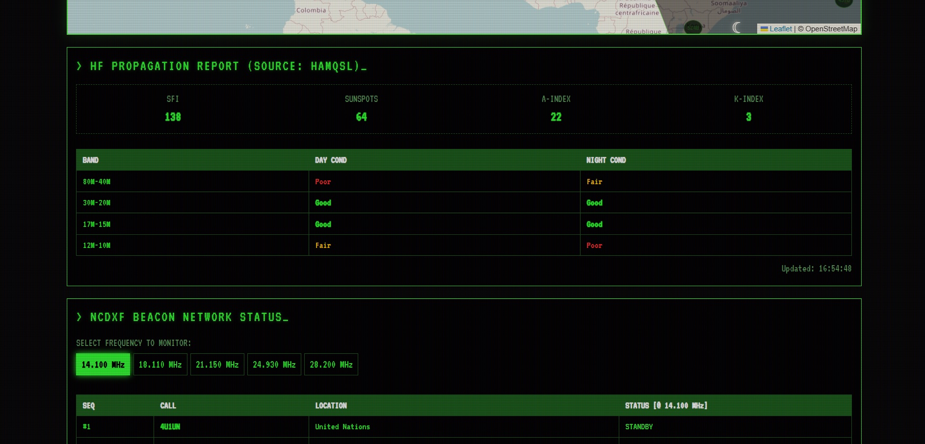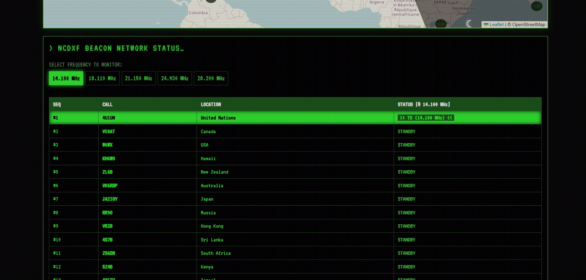 NCDXF Beacons: A synchronized panel showing exactly which beacon is transmitting at that specific second across all bands (14.100, 18.110, etc.) and highlighting it on the map.