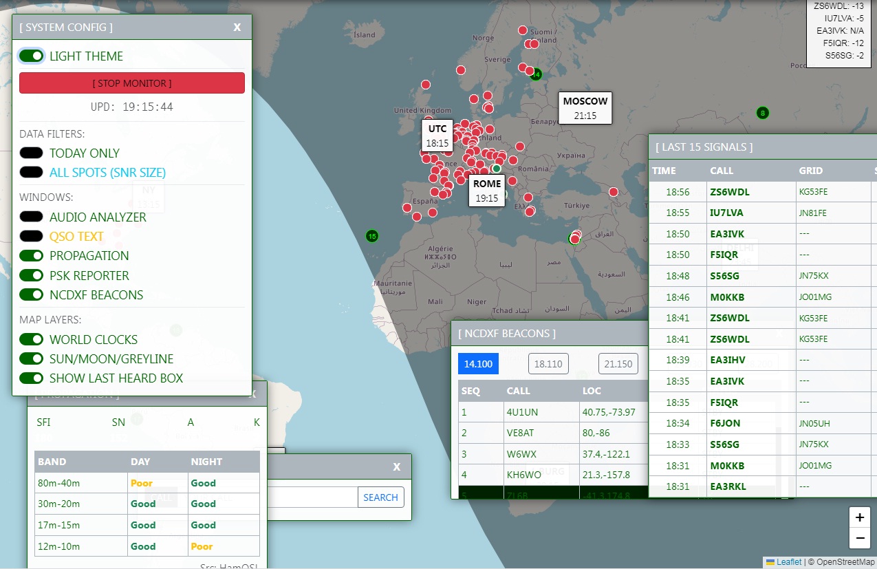 HF Propagation Monitor: Real-time solar data (SFI, Sunspots, A/K Index) fetched from HamQSL, indicating conditions (Good/Fair/Poor) per band (Day/Night).