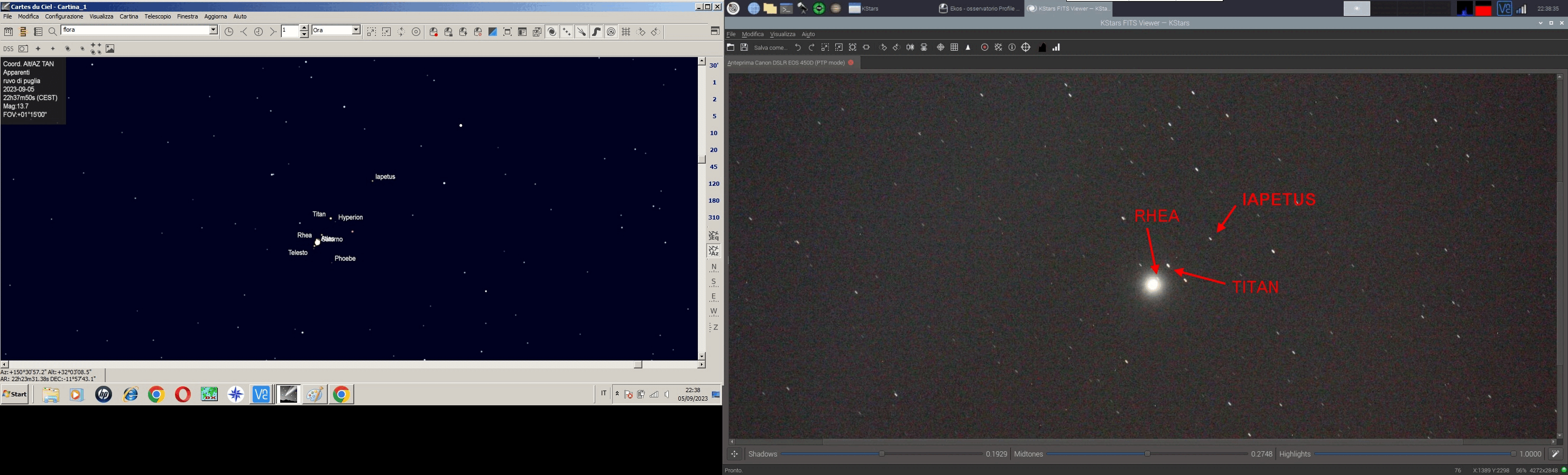 Con queste riprese di Saturno volevo cimentarmi nell' osservare il movimento delle lune di Saturno e con un pò di stupore mi sono imbattuto nel movimento orbitale di Saturno stesso. Saturno orbita intorno al Sole ad una distanza di un miliardo e 429 milioni di Km, completando una rivoluzione in 29,5 anni. Ho fotografato Saturno due sere consecutivamente rispettivamente il giorno 5 e 6 Settembre 2023 e utilizzando la tecnica di blinking delle immagini su stessa scala, nell' immagine animata che vedete si puo' osservare come il fondo stellato rimane immutato e Saturno e le sue lune si spostano. Le Lune visibili sono Iapetus, Titan e Rhea. Altra cosa che mi ha stupito di questa sequenza che ho ripreso è il fatto che le lune Iapetus e Titan (denominazione inglese) sembrano praticamente seguire lo spostamento di Saturno ma risultano immobili rispetto ad esso invece la luna Rhea essendo vicina al pianeta ha un orbita molto piu veloce. La Luna piu' distante di Saturno, Giapeto ,mostra sempre la stessa faccia a Saturno ed orbita ad una distanza di ben 3.561.000 chilometri e vi lascio immaginare come ci apparirebbero gli anelli di Saturno da quella distanza. Nelle foto trovate uno scatto stupefacente fatto a Giapeto dalla sonda Cassini, da notare la cresta equatoriale che questa luna possiede.Questo tipo di riprese animate nel tempo con telescopio stazionato in modo permanente è davvero una marcia in piu' per lo studio e l' osservazione dei corpi celesti.