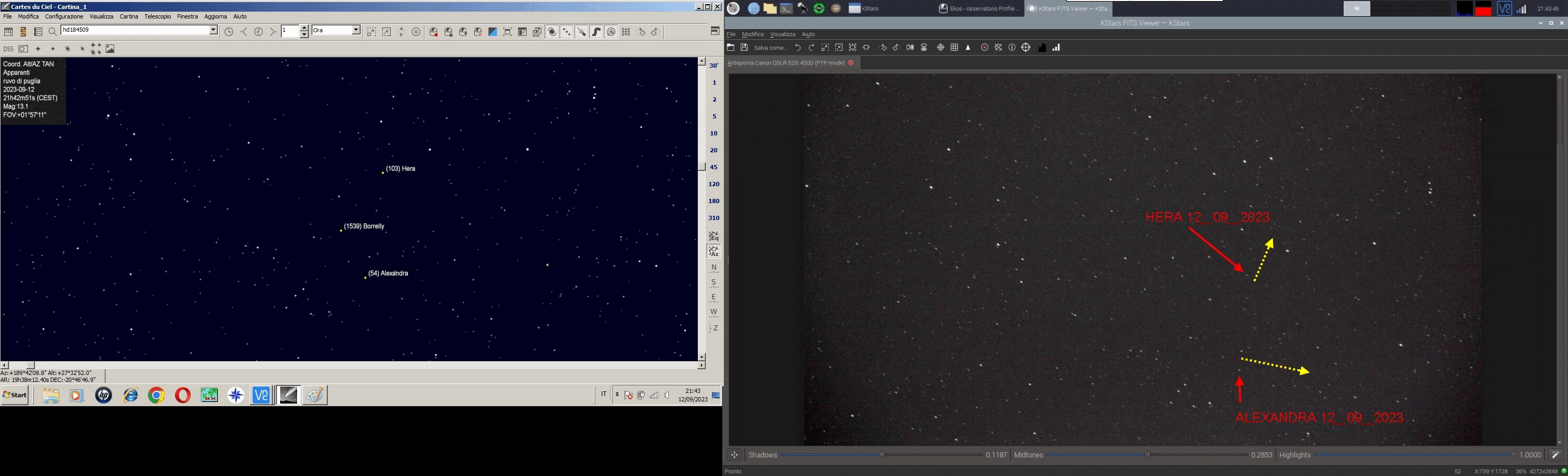E' da tempo che mi ero messo in testa di andare a caccia di piu' di un corpo in movimento da immortalare nella stessa inquadratura e quindi dopo aver aggiornato la lista degli asteroidi ed i rispettivi parametri orbitali, facendo simulazioni sul software Cartes du Ciel, ho beccato due asteroidi abbastanza vicini ma con parametri orbitali totalmente differenti. Gli asteroidi in questione sono Alexandra ed Hera. Le riprese fatte in tre giorni consecutivi permette di capire come nella fascia principale degli asteroidi regna ancora il caos e dobbiamo dire grazie al nostro spazzino del sistema Solare (Giove) che grazie alla sua enorme massa attrae a se questi corpi vaganti. Grazie a Giove abbiamo delle orbite interne relativamente pulite. Le riprese dei due asteroidi sono state fatte rispettivamente i giorni 12-13-14 Settembre 2023 e nella foto animata sono indicate in rosso le rispettive posizioni ed in giallo le traiettorie che seguono entrambe gli asteroidi.