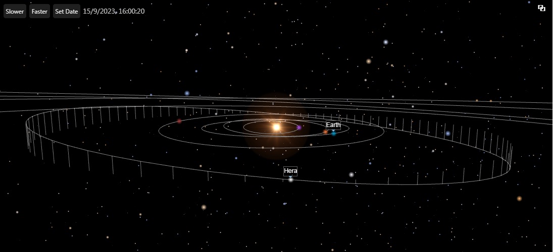 L'asteroide Hera orbita intorno al sole in 4,44 anni ed ha un diametro di circa 91,58 chilometri. Ha una distanza massima di quasi tre volte la distanza Terra - Sole e viaggia ad una velocità di 18,09 km/S.